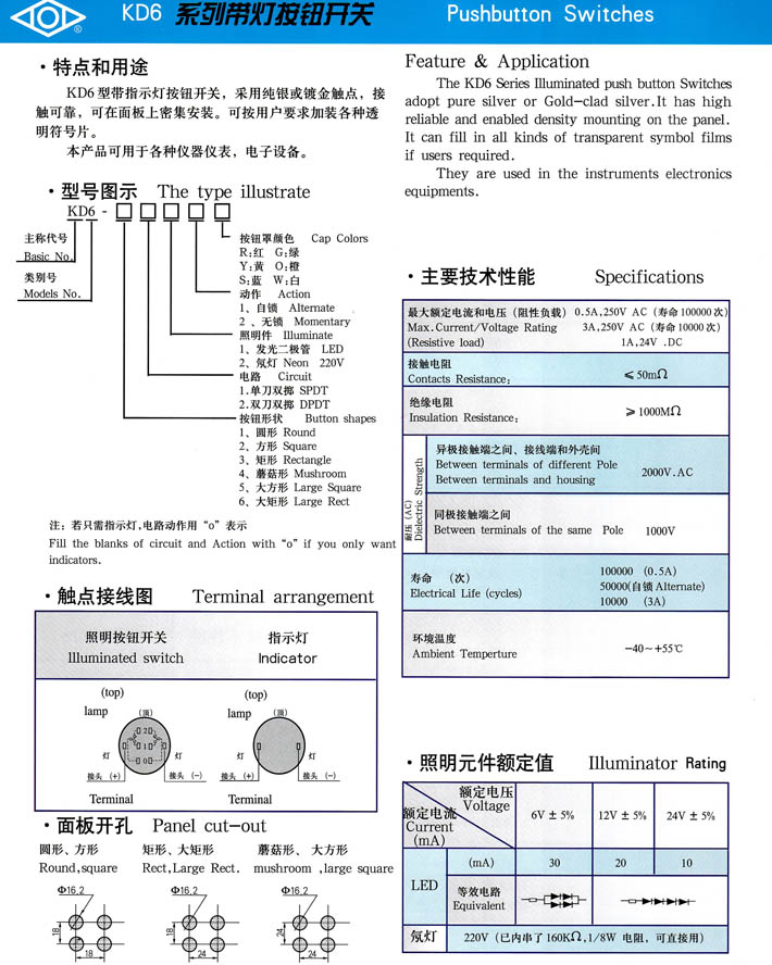 • KD6系列帶燈按鈕開關(guān) 產(chǎn)品型號:KD6系列帶燈按鈕開關(guān)
